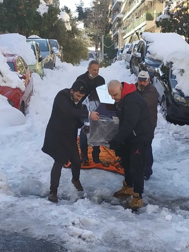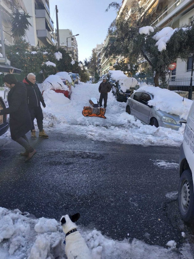 Εργαζόμενοι σε γραφείο τελετών μεταφέρουν φέρετρο σπρώχνοντας το στο χιόνι στην οδό Πλαστήρα του Ζωγράφου. Οι δρόμοι ήταν γεμάτοι χιόνι και αποφάσισαν να μετακινήσουν με αυτό τον άκομψο και μακάβριο τρόπο τον νεκρό.