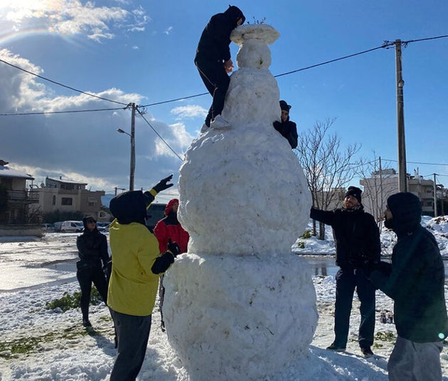 Περισσότερες από τρεις ώρες χρειάστηκε μια παρέα στις Αχαρνές Αττικής για να κατασκευάσει τον υψηλότερο χιονάνθρωπο στη χώρα, ύψους 4,5 μέτρων, χάρη στο άφθονο χιόνι που έπεσε στην περιοχή κατά τη διάρκεια της κακοκαιρίας «Ελπίδα».