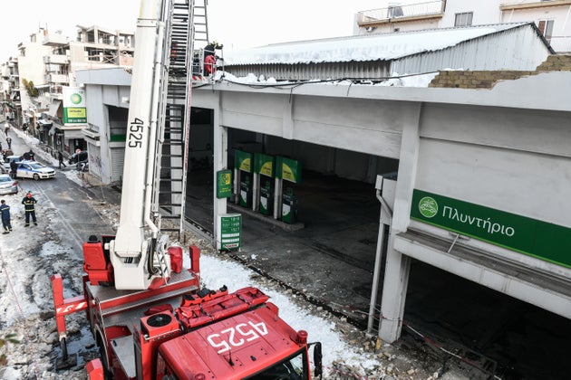 Τμήμα οροφής σε πρατήριο καυσίμων στο Παγκράτι κατέρρευσε από το βάρος του χιονιού νωρίς το πρωί της Πέμπτης.