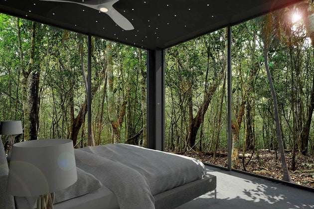 Στο σπίτι, οι επισκέπτες θα βρουν ένα υπνοδωμάτιο που περιβάλλεται από γυάλινη τζαμαρία από το δάπεδο μέχρι την οροφή και έχει θέα στο δάσος.