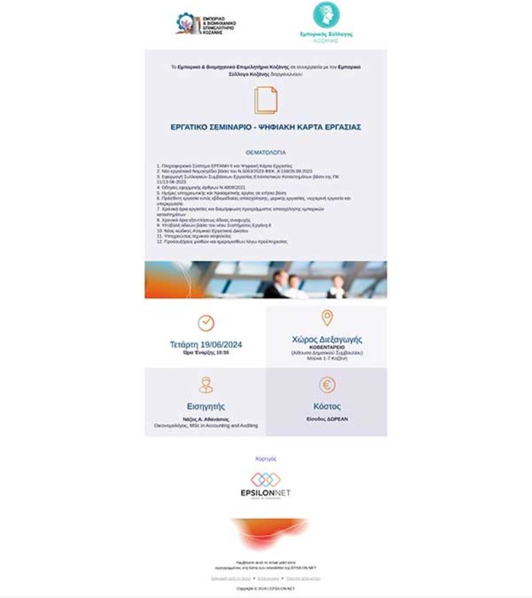 Εργατικό Σεμινάριο για τα μέλη του διοργανώνει ο Εμπορικός Σύλλογος Κοζάνης σε συνεργασία με το Εμπορικό & Βιομηχανικό Επιμελητήριο Κοζάνης, αύριο Τετάρτη 19/06/2024, στις 18:30, στην Αίθουσα του Δημοτικού Συμβουλίου στο Κοβεντάρειο. Στο σεμινάριο, που γίνεται με αφορμή την έναρξη εφαρμογής της ψηφιακής κάρτας εργασίας από την 01-07-2024, θα αναπτυχθούν διάφορα θέματα, από τον εισηγητή, Αθανάσιο Νάζο (οικονομολόγο), ενώ θα γίνει και σύντομη ενημέρωση από εκπρόσωπο της ΔΥΠΑ Κοζάνης για τα νέα επιδοτούμενα προγράμματα πρόσληψης εργαζομένων.
