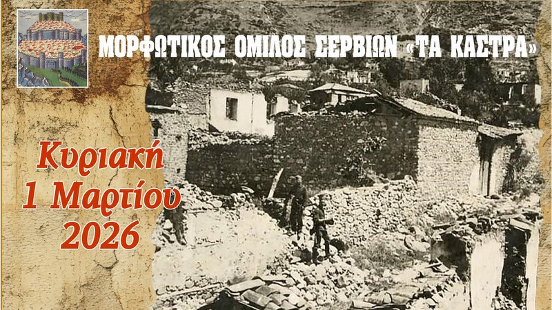 Εκδήλωση Μνήμης για το Ολοκαύτωμα της Μαρτυρικής πόλης των Σερβίων, τον Μάρτιο του 1943, διοργανώνει ο Μορφωτικός Όμιλος Σερβίων «Τα Κάστρα». Η εκδήλωση θα πραγματοποιηθεί την Κυριακή, 1η Μαρτίου 2026, στις 12:00, στην αίθουσα του Πολιτιστικού Κέντρου Σερβίων, όπου θα μιλήσει ο Καθηγητής Ιστορίας του Α.Π.Θ., Ευστράτιος Δορδανάς, με θέμα «Το χρονικό της Καταστροφής: Σέρβια 1943».