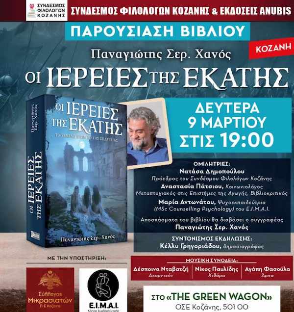 Το νέο βιβλίο του δημοσιογράφου – συγγραφέα, Παναγιώτη Χανού, “Οι Ιέρειες της Εκάτης: το χαμένο Χρονικό της Σηλυβρίας”, θα παρουσιαστεί σήμερα Δευτέρα 9 Μαρτίου 2026, στις 19.00, στο café THE GREEN WAGON, στην περιοχή ΟΣΕ, Κοζάνης. Για το βιβλίο, εκτός από τον συγγραφέα, θα μιλήσουν, οι: Νατάσα Δημοπούλου (Πρόεδρος του Συνδέσμου Φιλολόγων Κοζάνης), Αναστασία Πάτσιου, (Φιλόλογος, Βιβλιοκριτικός) και Μαρία Αντωνάτου (Ψυχοεκπαιδεύτρια). Αποσπάσματα του βιβλίου θα διαβάσει ο ίδιος ο συγγραφέας και συντονίστρια της συζήτησης θα είναι η δημοσιογράφος, Κέλλυ Γρηγοριάδου. Την εκδήλωση θα πλαισιώσουν με μουσική, η Δέσποινα Νταβατζή (στο Aκορντεόν) και ο Νίκος Παυλίδης (στην Kιθάρα).