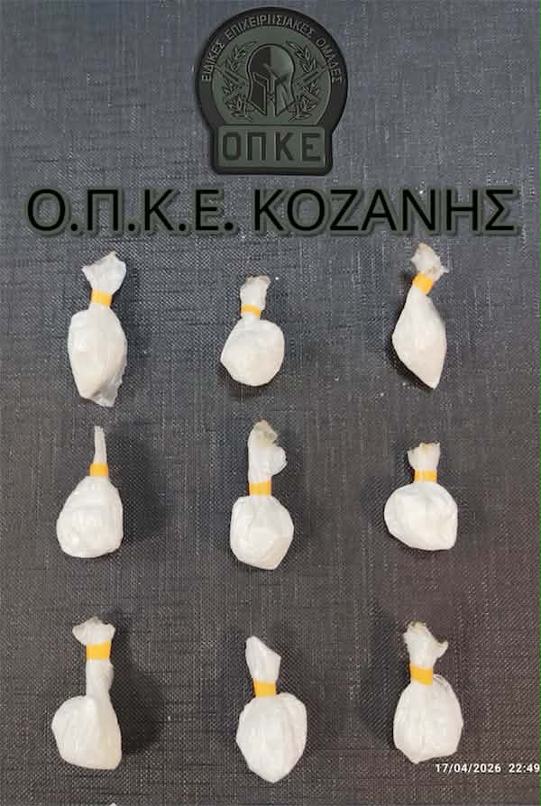 «Συνελήφθη, χθες (17-04-2026) το βράδυ σε περιοχή της Κοζάνης, από αστυνομικούς της Ομάδας Πρόληψης και Καταστολής Εγκλήματος (Ο.Π.Κ.Ε.) του Τμήματος Δίωξης και Εξιχνίασης Εγκλημάτων Κοζάνης, 37χρονος ημεδαπός, για κατοχή ναρκωτικών ουσιών. Ειδικότερα, στο πλαίσιο συντονισμένης δράσης για την καταπολέμηση της διακίνησης ναρκωτικών ουσιών, βραδινές ώρες χθες, σε περιοχή της Κοζάνης, πραγματοποιήθηκε από τους προαναφερόμενους αστυνομικούς έλεγχος στον 37χρονο, όπου βρέθηκαν στη κατοχή του και κατασχέθηκαν 9 ποσότητες κοκαΐνης, συνολικού μεικτού βάρους 7,9 γραμμαρίων.